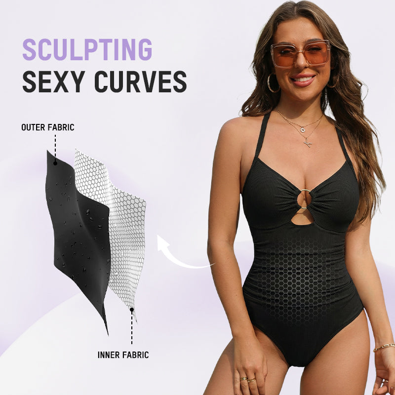 Designed with a deep V-neck and chic O-ring detail, this one-piece enhances your natural curves beautifully. The high-stretch ribbed fabric and waist ruching visually slim the midsection—especially flattering for curvy bodies.