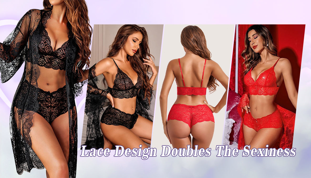 Featuring a sexy floral lace bralette and panty set, this look is all about confidence and comfort. The soft sheer lace fabric hugs your body with a gentle stretch, while the lace-trimmed robe drapes beautifully — perfect whether worn or slipped off, available in timeless black or red.