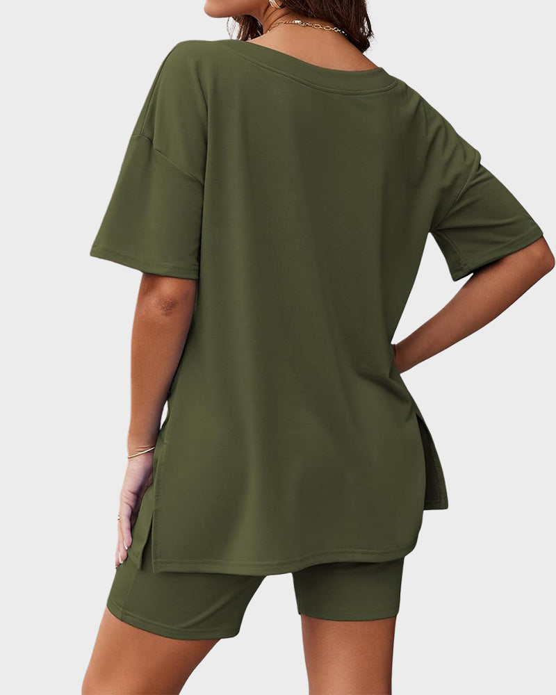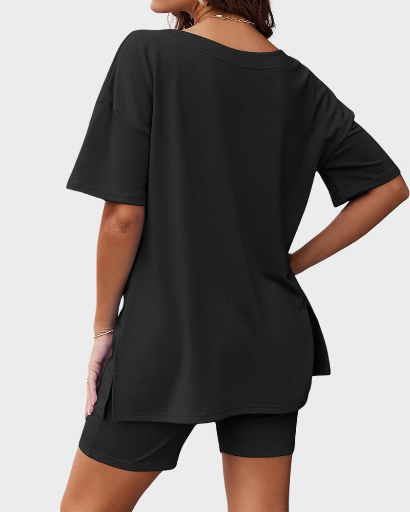 Slip into effortless comfort and confidence with this summer-ready 2-piece loungewear set. Designed to flatter all body types, the deep V-neck oversized tee and curve-hugging biker shorts are perfect for lounging, layering, or stepping out in style. Soft, breathable, and incredibly versatile—you'll never want to take it off.