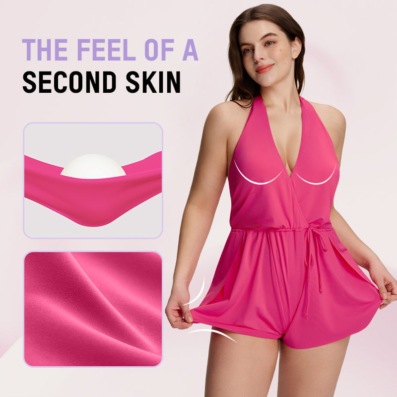 The relaxed romper overlay skims the body without clinging, while the inner swimsuit keeps everything secure.