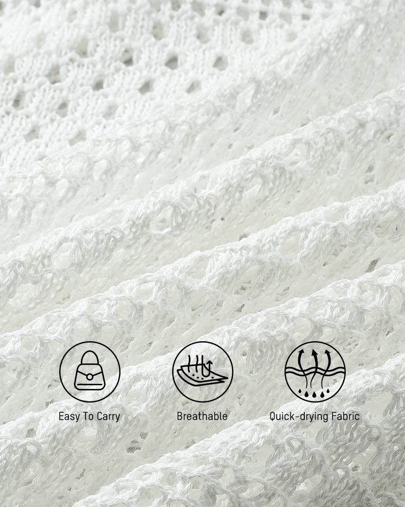 Crafted with airy crochet knit, this fabric offers breathability, slight stretch, and quick-dry performance—designed as your perfect second-skin layer for hot summer days on the beach.