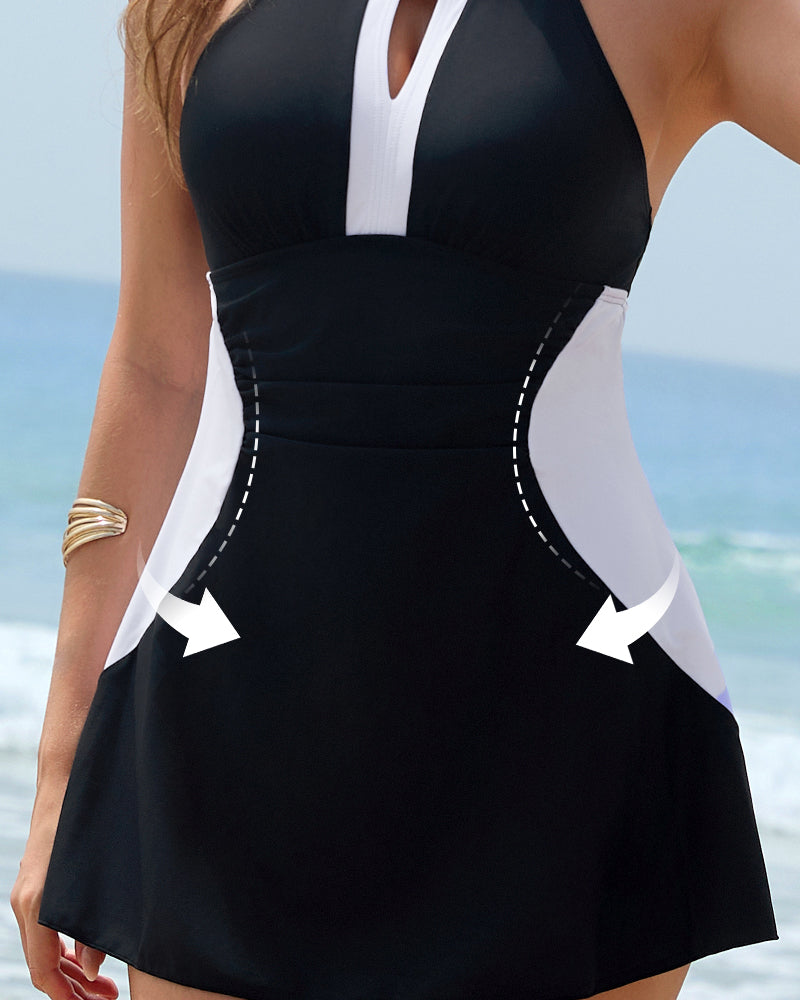 High-contrast side panels sculpt your waistline for a slimming look. The open-back design with wide cross-back straps offers adjustable support, while the breathable fabric moves with you for all-day comfort—on the beach or in the pool.