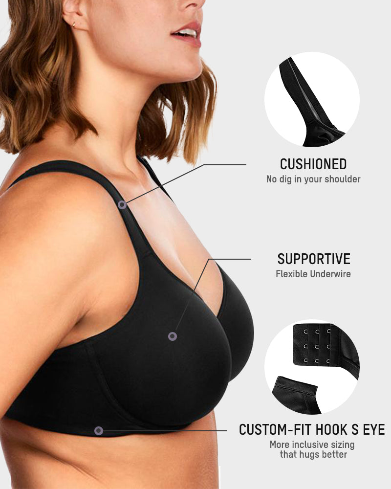 Say goodbye to bra lines & texture showing through tees. This totally smooth minimizer design delivers a sleek, invisible look under any outfit — giving you a clean, polished silhouette from day to night. Higher side wings smooth back and underarm bulges for a flawless finish under clothing.